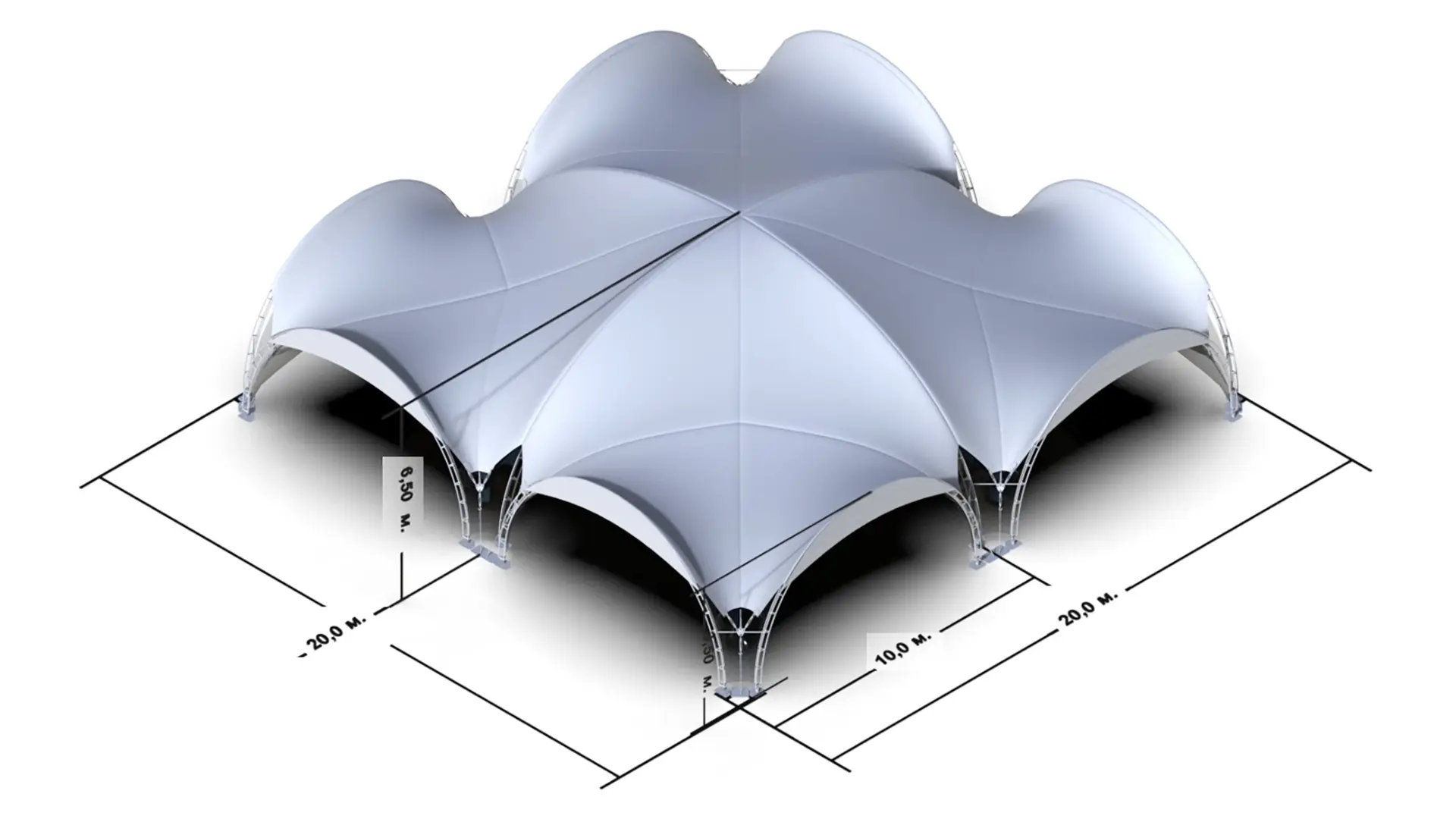 Благодаря квадратной форме и шатровой крыше, конструкция обеспечивает равномерное распределение нагрузок, отличную ветроустойчивость и эффективный отвод осадков. Возможность масштабирования с использованием модулей 8×8 м и 8×4 м позволяет адаптировать шатер под любые задачи — от компактных объектов до крупных комплексов.