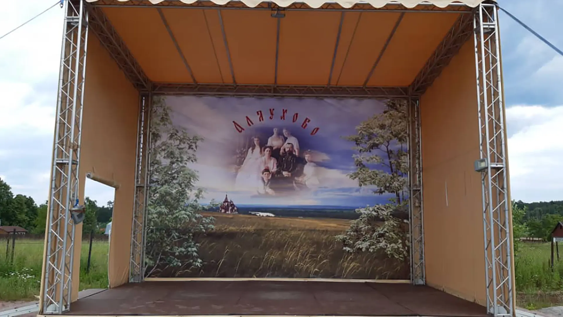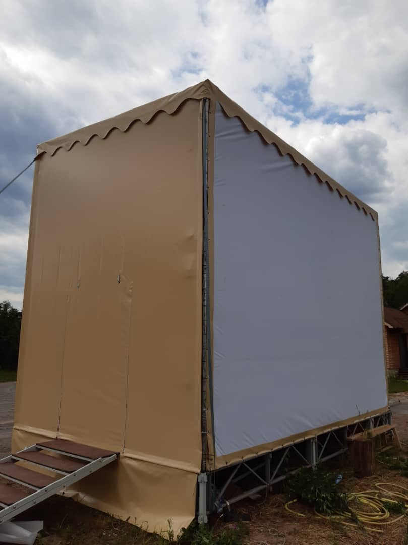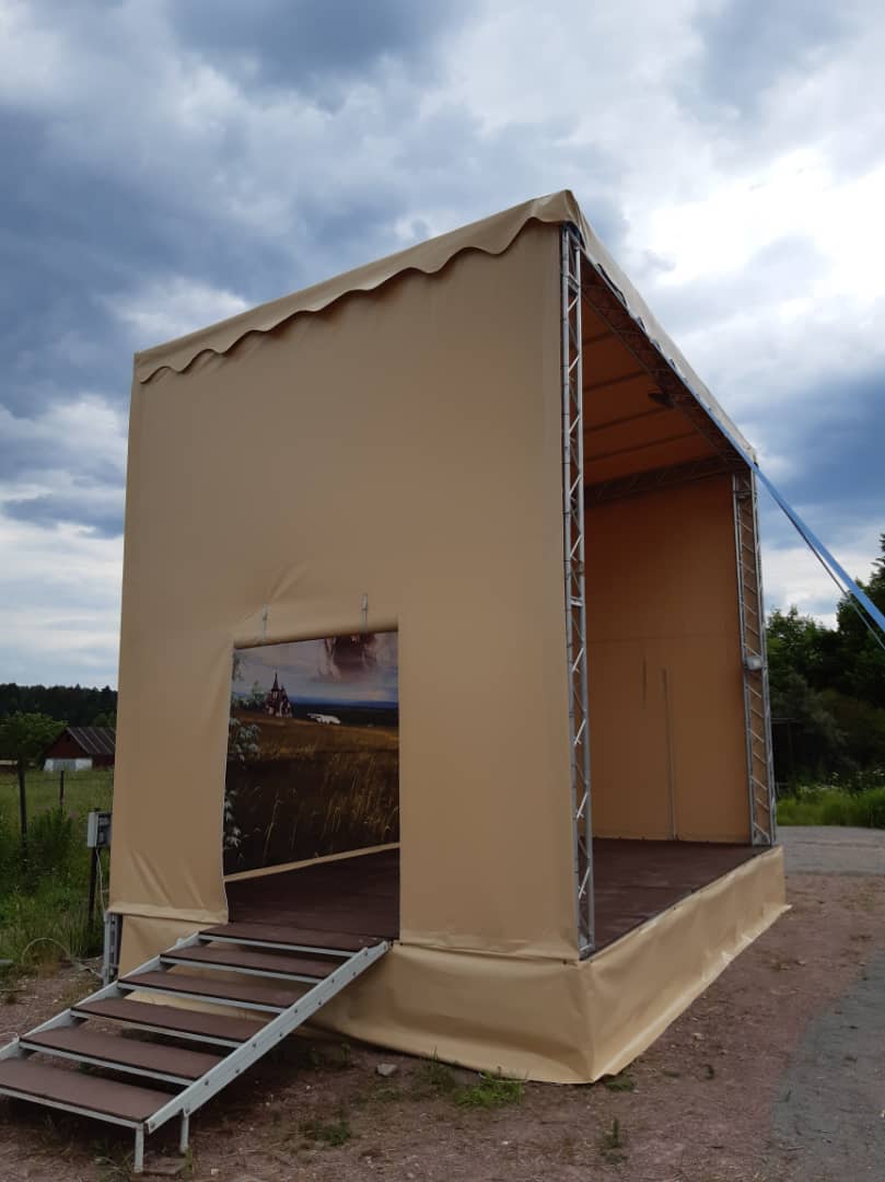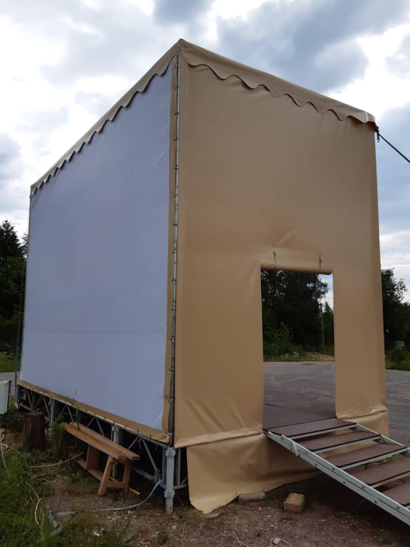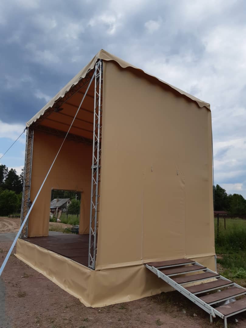 Изготовление тентового покрытия для уличной сцены. Конструкция защищает выступающих и оборудование от осадков и солнца. Мобильная сцена монтируется за несколько часов.