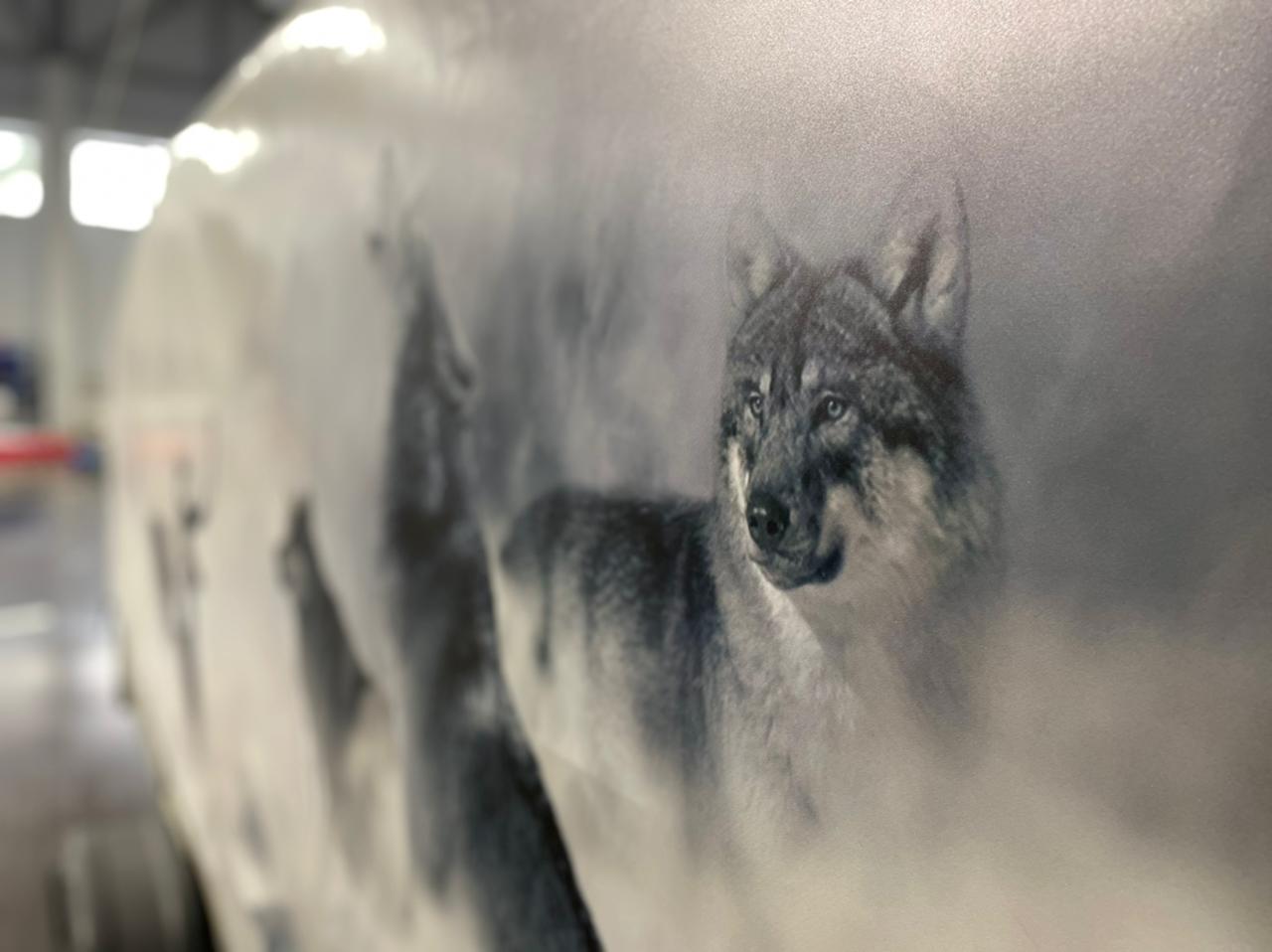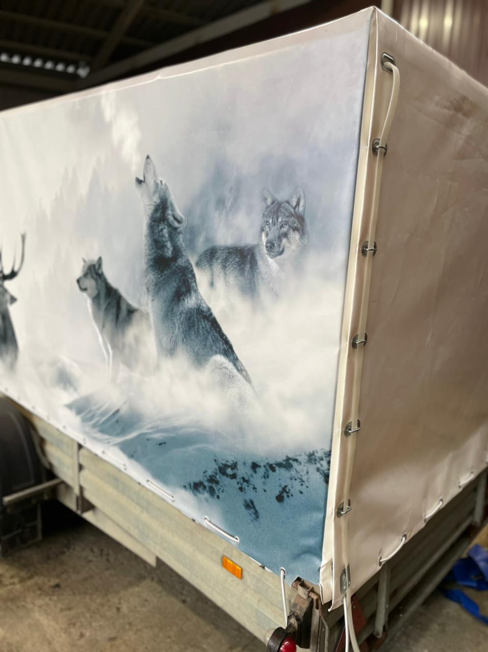 Нанесение полноцветного изображения методом прямой УФ-печати на тентовую ткань. Разрешение до 720 dpi, устойчивость к выгоранию и влаге. Использовали для нанесения логотипа заказчика на тент грузового автомобиля.